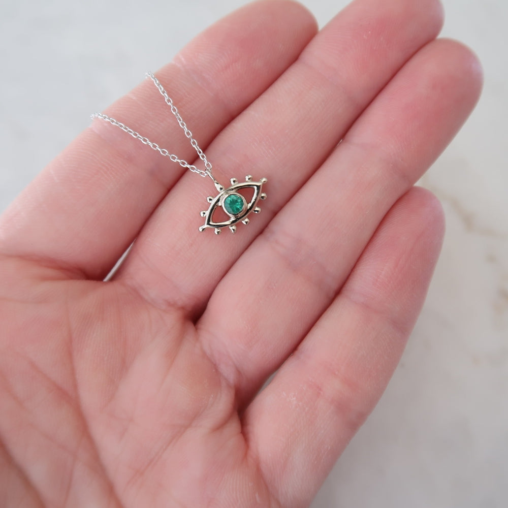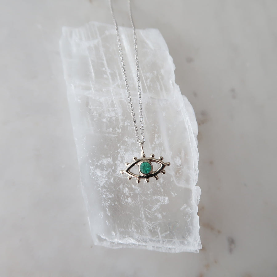 Striking eye pendant featuring an emerald center. Adjustable chain allows you to wear it at 16, 17 or 18" lengths.