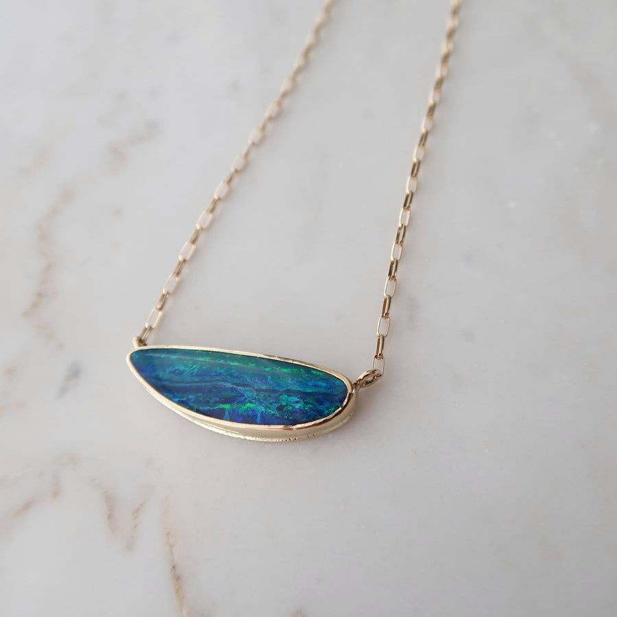 Freeform Australian opal pendant, bezel set in 14k yellow gold. Gorgeous flashes of lagoon-like blues and greens.