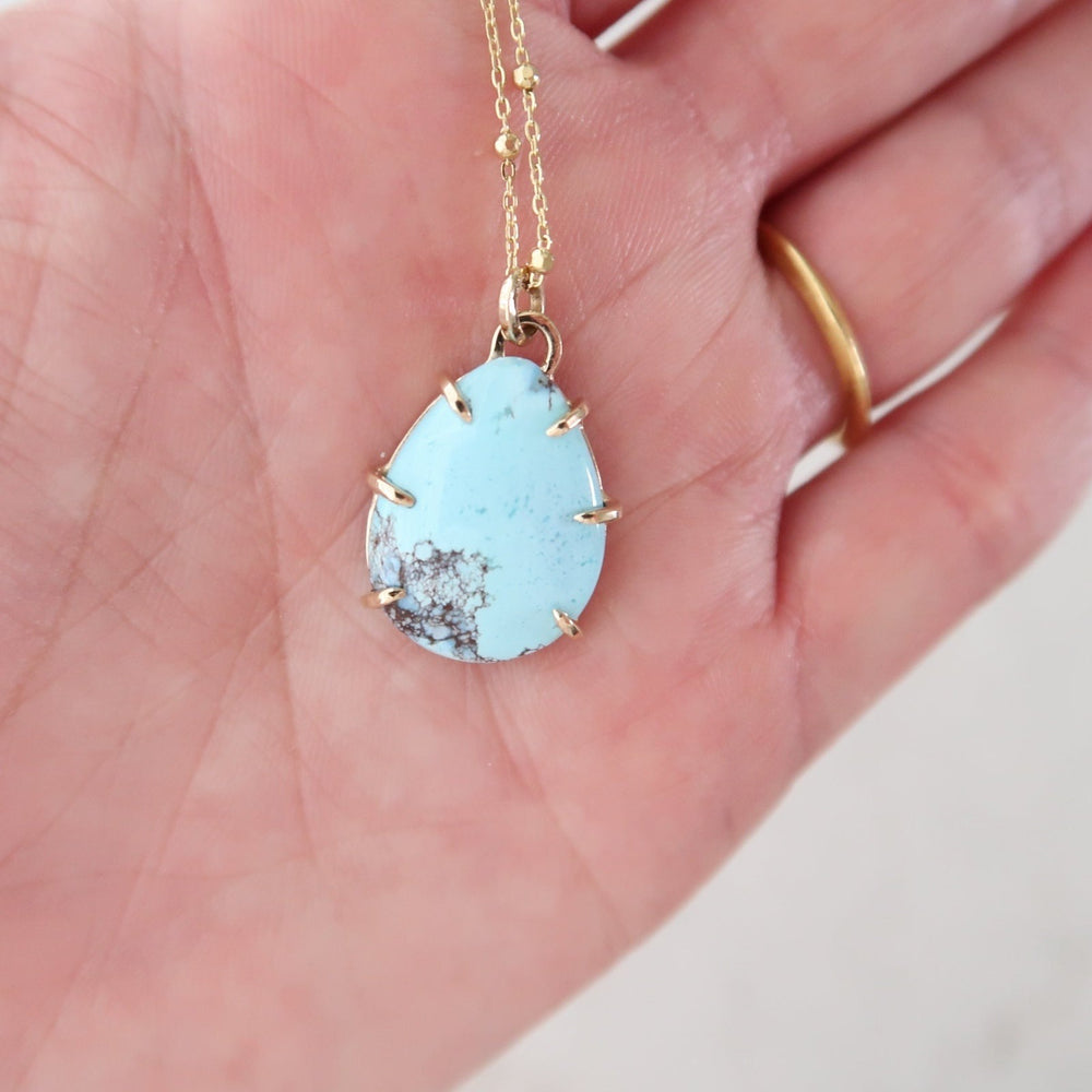 Simply stunning AAA quality Golden Hills turquoise. Highly sought after for its desirable lavender-blue color. Gorgeous matrix pattern. Minimally set in 14K yellow gold to showcase the power of the stone. The back is just as pretty as the front!