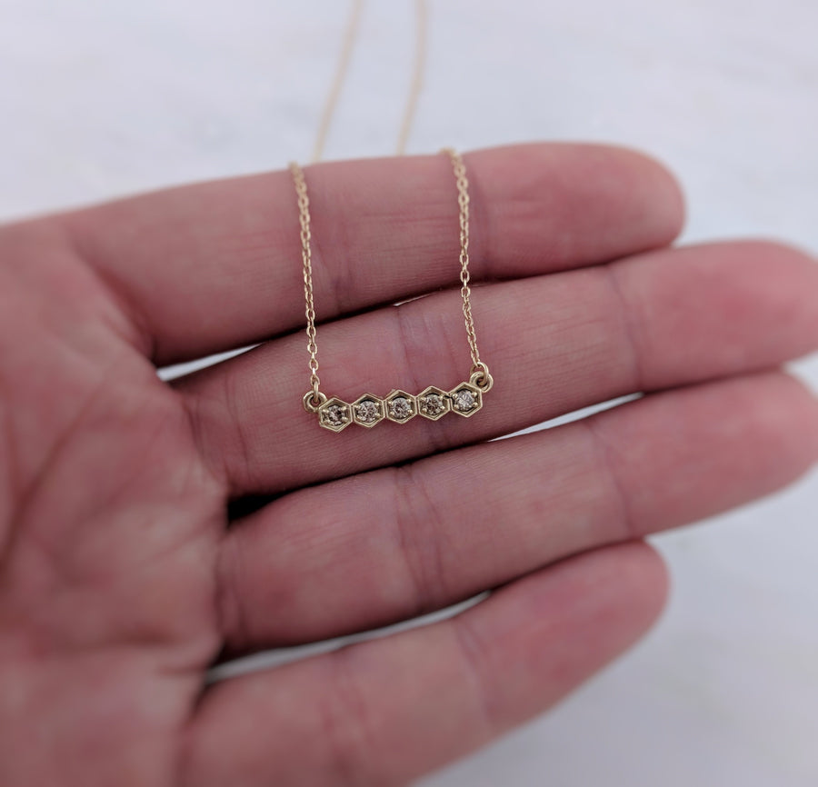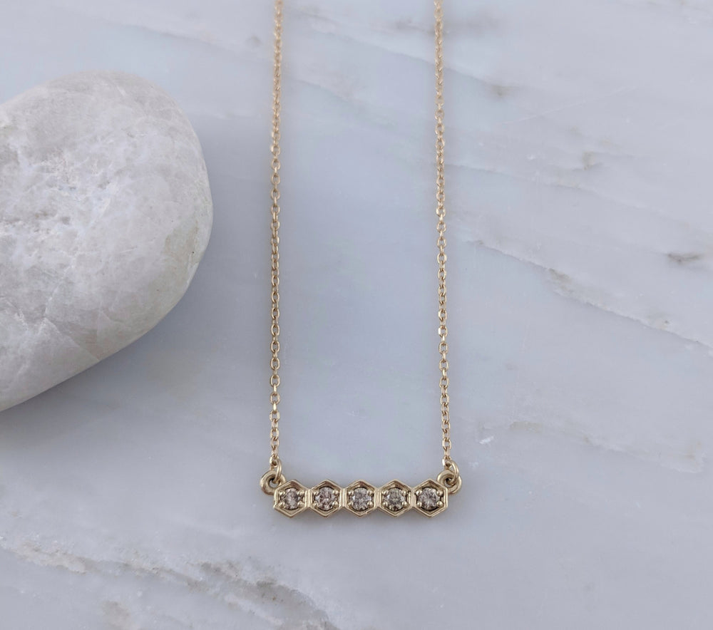 Boho and elegant! Unique hexagon shaped pendant features 5 gorgeous champagne colored diamonds. Matching minimal chain in 14K yellow gold. Chain is adjustable for a customized fit - adjust to 16, 17 or 18 inch length chain. This is a gorgeous everyday necklace for the minimalist. Also looks fantastic layered with your other favorite pieces!
