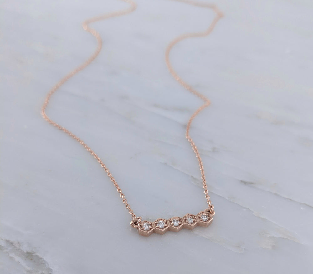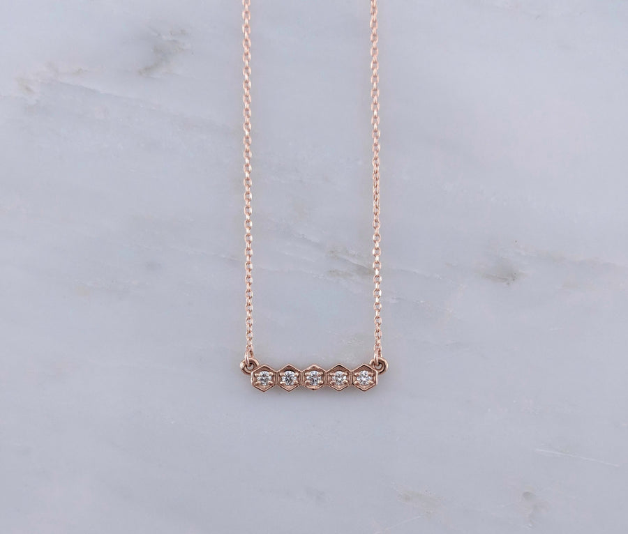 Boho and elegant! Unique hexagon shaped pendant features 5 gorgeous bright diamonds. Matching minimal chain in 14K rose gold. Chain is adjustable for a customized fit - adjust to 16, 17 or 18 inch length chain. This is a gorgeous everyday necklace for the minimalist. Also looks fantastic layered with your other favorite pieces!