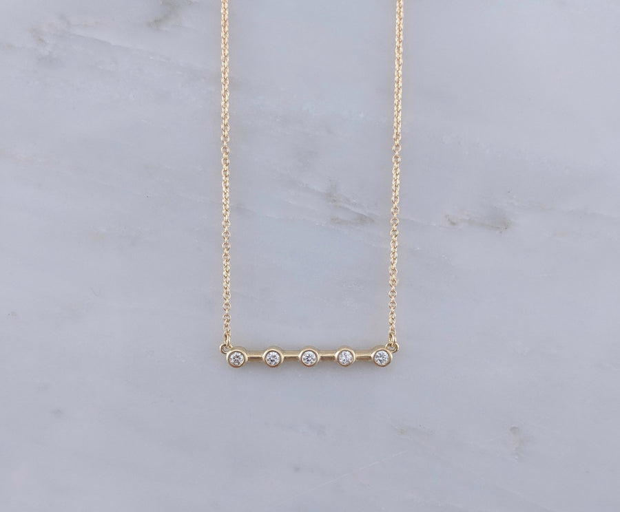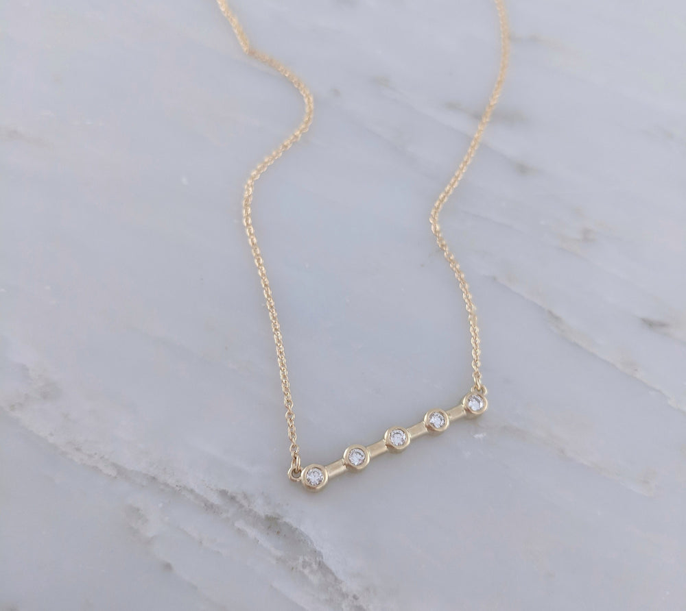 This is your new go to! Minimal 14K gold bar pendant features 5 small bezel set diamonds. The five diamonds could be a lovely representation for a 5 year anniversary or other significant milestone. Matching minimal chain in 14K yellow gold. Chain is adjustable for a customized fit - adjust to 16, 17 or 18 inch length chain. This is a gorgeous everyday necklace for the minimalist. Also looks fantastic layered with your other favorite pieces!