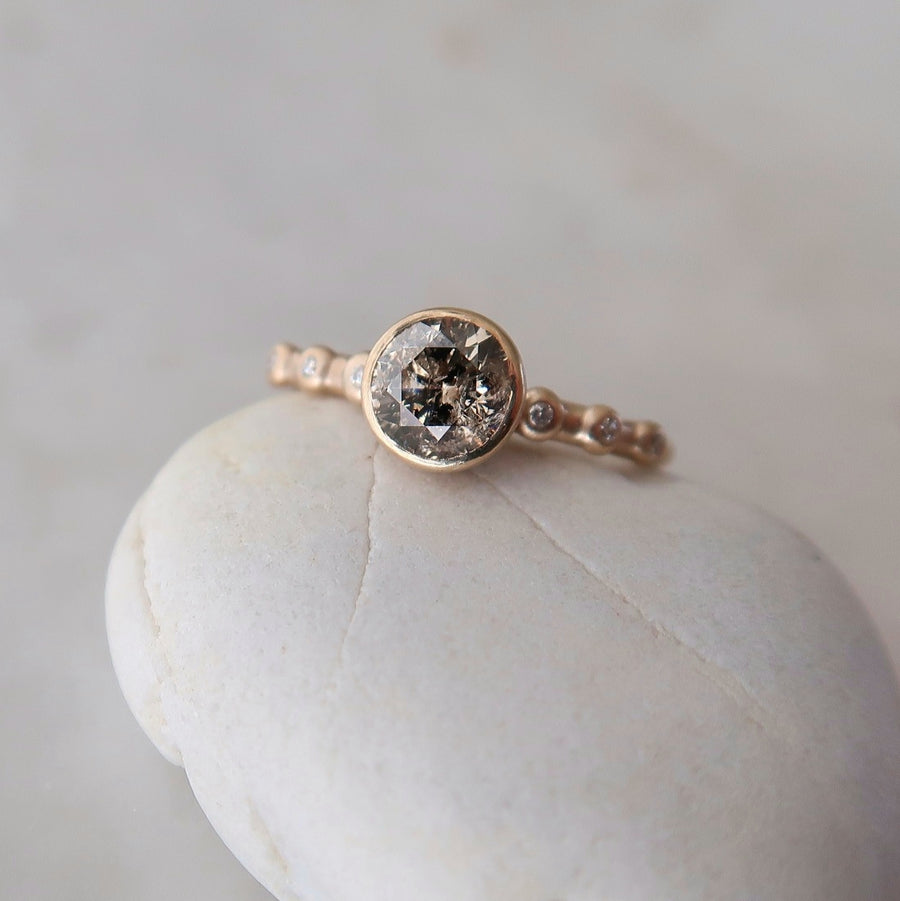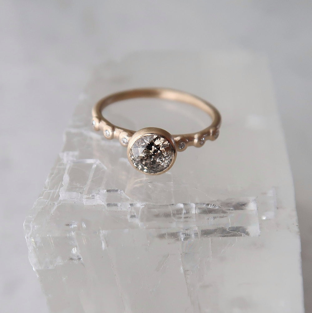 Gorgeously complex salt and pepper diamond with hints of champagne coloring set in elevated bezel. Slim, round band with dotted detail and accent diamonds. Warm yellow gold in signature satin/matte finish.